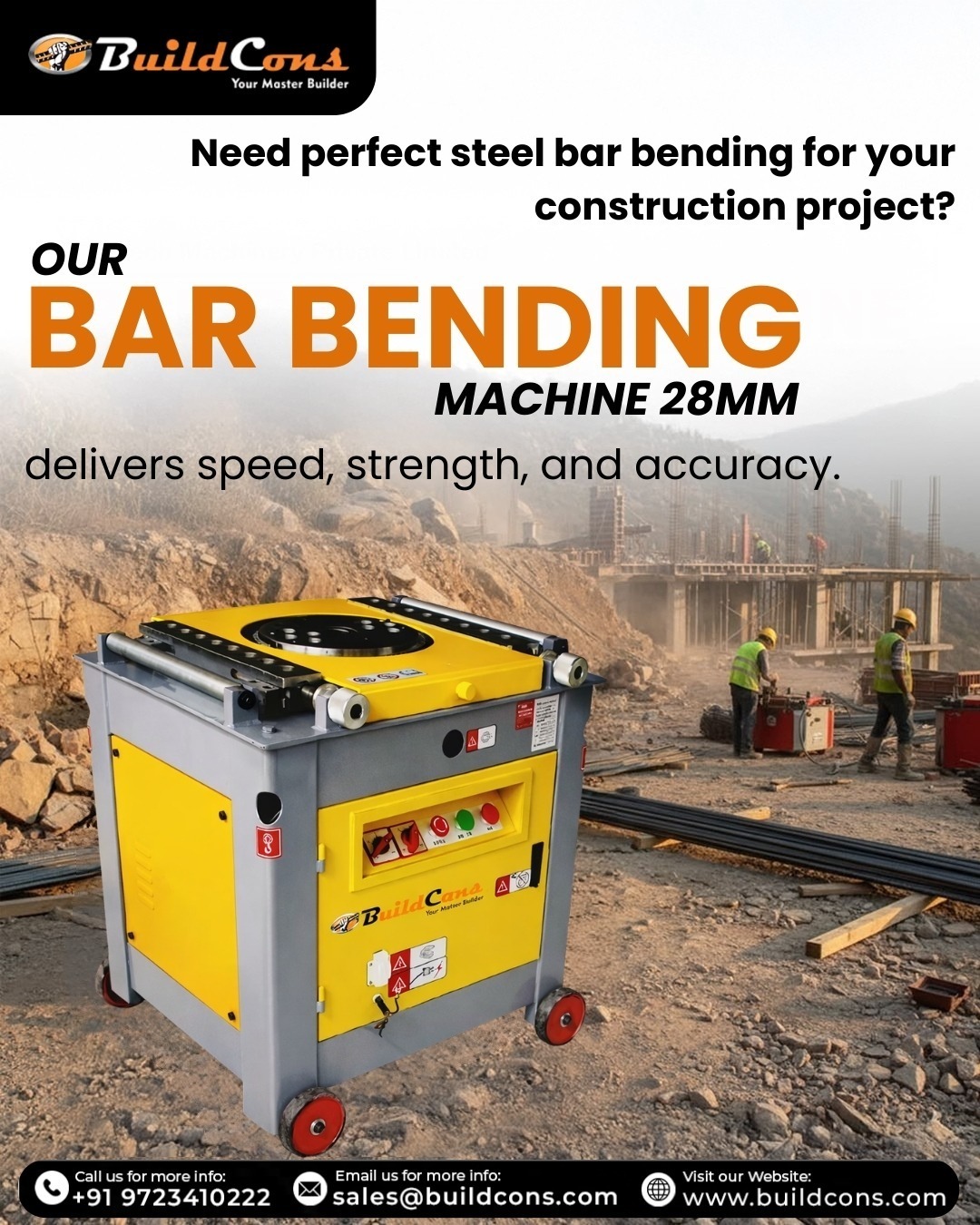 BuildCons is a trusted Bar Bending Machine Manufacturer in Ahmedabad, offering high-performance machines for the accurate, efficient bending of steel reinforcement bars used in construction projects. These industrial-grade machines are built to handle rebar up to 28 mm in diameter, making them ideal for heavy-duty structural applications. Engineered for durability and productivity, bar-bending machines typically operate on a 3-phase 400–415V power supply and are capable of delivering fast bending cycles in under 5 seconds. Their strong industrial frame ensures stability during continuous operation, making them suitable for high-volume work environments. Many models also feature foot pedal controls and digital angle settings, allowing operators to achieve precise bends with minimal effort. These machines are widely used on construction sites to shape reinforcement bars for columns, beams, slabs, and foundations. They are also essential for steel fabrication units and infrastructure projects that require accurate rebar bending. Portable models also enable on-site processing, allowing quick adjustments and improving project efficiency. Recognized as a reliable Bar Bending Machine Supplier in India and Bar Bending Machine Distributor in Gujarat, BuildCons provides durable equipment tailored to modern construction requirements. Contact BuildCons today for high-quality bar bending machines that deliver strength, precision, and long-term performance.